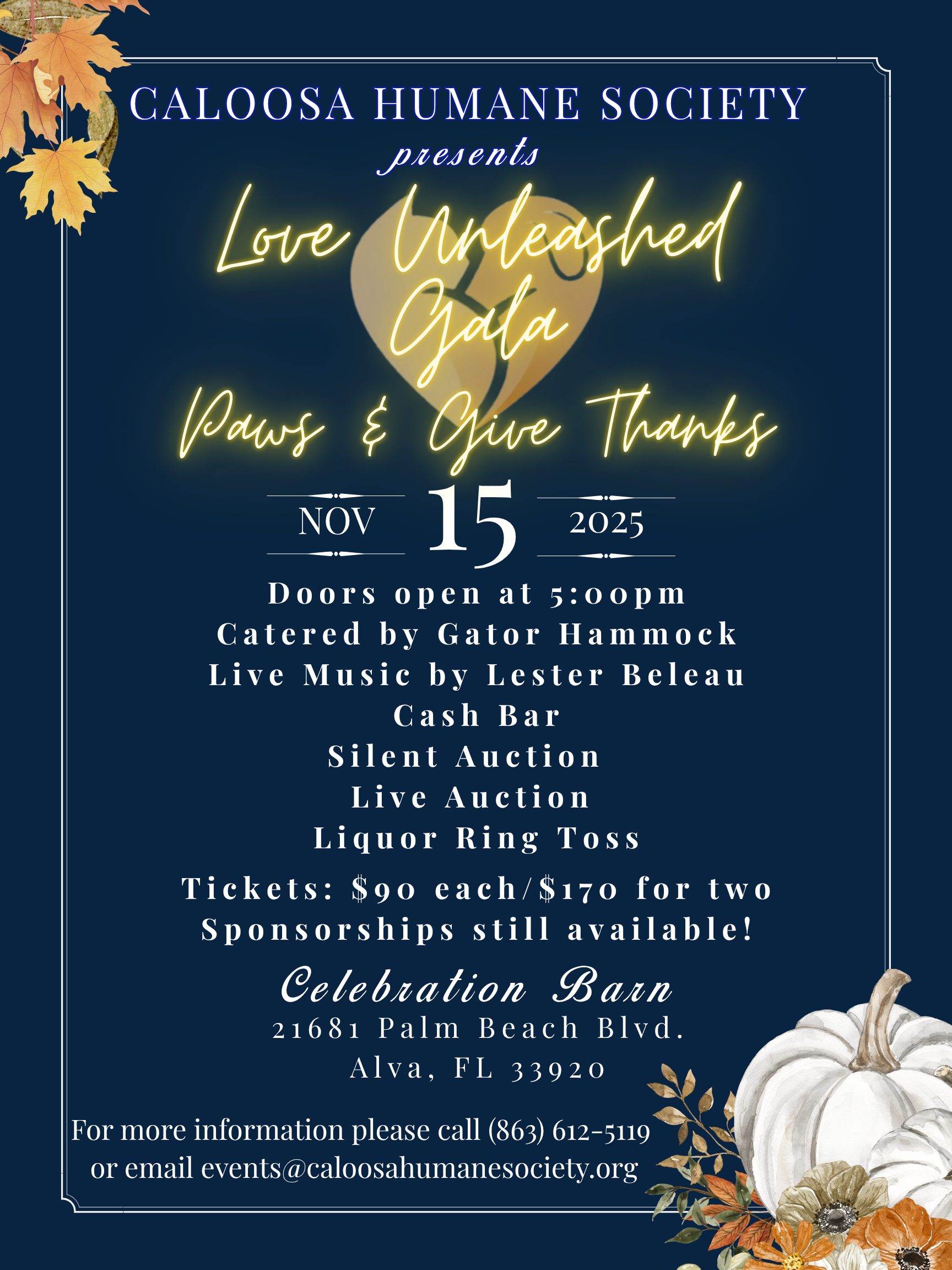 The 2025 Love Unleashed Gala is November 15th! Please join us for a night to eat, drink and be merry while helping raise money for our shelter pets. Please visit the Events Page for more details. We hope to see you there!
